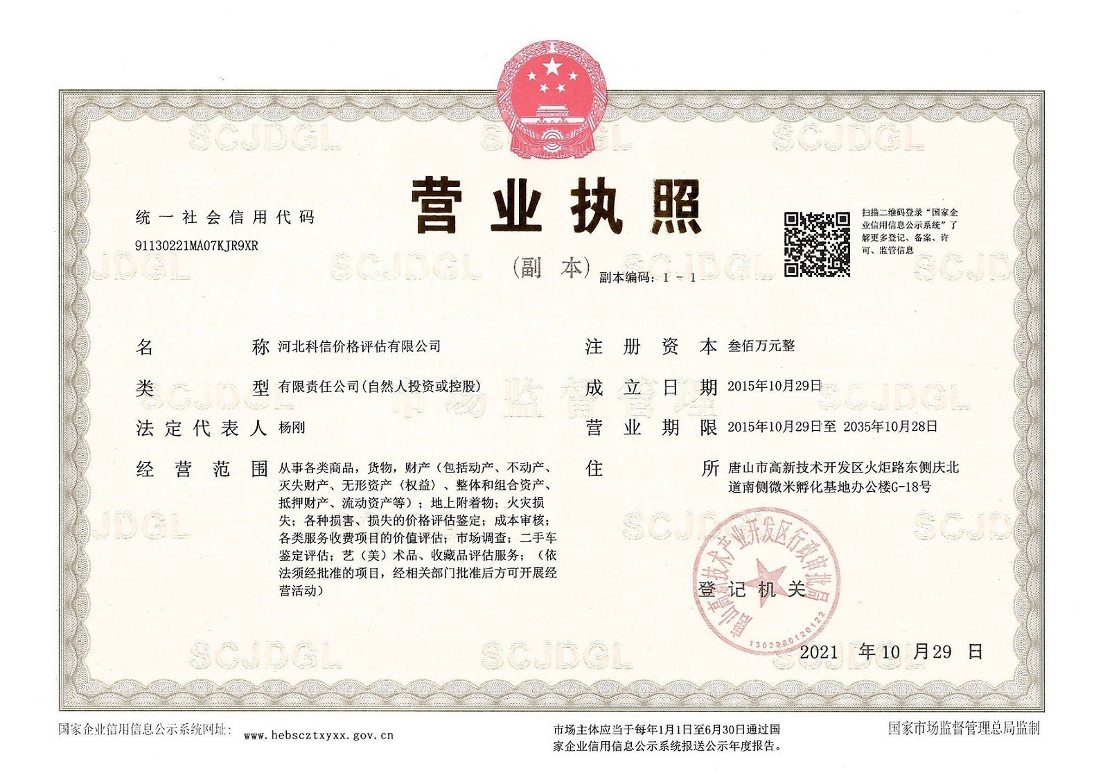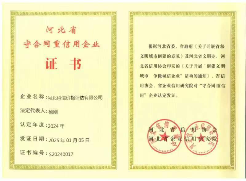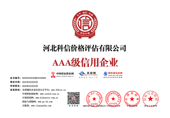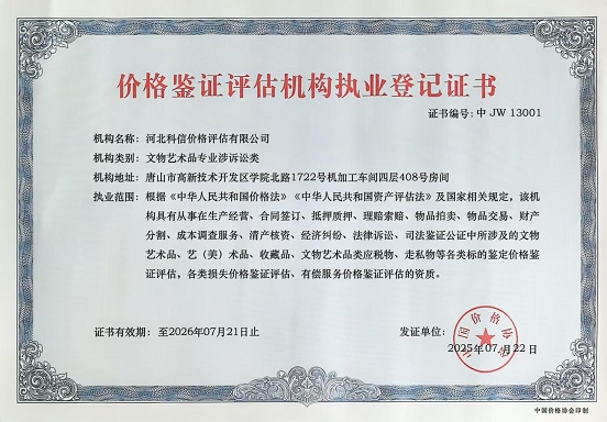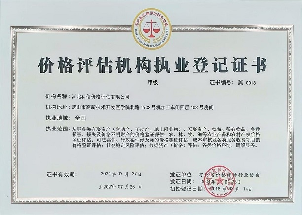 河北科信價(jià)格評(píng)估有限公司為"AAA"級(jí)信用企業(yè),具有商務(wù)部、文化部備案,頒發(fā)相關(guān)鑒定與專業(yè)評(píng)估資質(zhì),由河北省價(jià)格評(píng)估行業(yè)協(xié)會(huì)頒發(fā)的“甲級(jí)”《價(jià)格評(píng)估機(jī)構(gòu)執(zhí)業(yè)登記證書》。公司是河北省價(jià)格評(píng)估行業(yè)協(xié)會(huì)常務(wù)理事單位,河北省科技型中小企業(yè),河北省政府中介超市入冊(cè)鑒定評(píng)估機(jī)構(gòu)、唐山市政府中介超市入冊(cè)的鑒定評(píng)估機(jī)構(gòu)、唐山仲裁委員會(huì)入冊(cè)鑒定評(píng)估機(jī)構(gòu)。依法在唐山工商行政管理部門注冊(cè)登記的獨(dú)立第三方評(píng)估機(jī)構(gòu)。公司成立于2015年,注冊(cè)資金300萬元人民幣,公司擁有多名價(jià)格鑒證師、價(jià)格評(píng)估專業(yè)人員、國家高級(jí)、中級(jí)機(jī)動(dòng)車鑒定評(píng)估師、中級(jí)涉案財(cái)物評(píng)估師、汽車估損師、保險(xiǎn)公估師、高級(jí)林業(yè)工程師等,為您提供專業(yè)優(yōu)質(zhì)的服務(wù),公司嚴(yán)格按照程序組織實(shí)施鑒定評(píng)估以及合法的市場(chǎng)調(diào)查業(yè)務(wù),所出具的價(jià)格評(píng)估報(bào)告書、意見書具有法律效力并為國家認(rèn)可。公司自成立以來共接受河北省交警系統(tǒng)、法院系統(tǒng)、檢察院系統(tǒng)、交通局系統(tǒng)、財(cái)政系統(tǒng)、銀行系統(tǒng)以及社會(huì)各界人士的各類委托3000余件,受到一致好評(píng)。在執(zhí)業(yè)過程中,我們將依照相關(guān)的法律、法規(guī),嚴(yán)格遵循客觀、獨(dú)立、公正、公平、科學(xué)性的原則;竭誠為您提供專業(yè)、權(quán)威的價(jià)格評(píng)估服務(wù)和信息咨詢服務(wù);為您提供專業(yè)、快捷的優(yōu)質(zhì)服務(wù)。